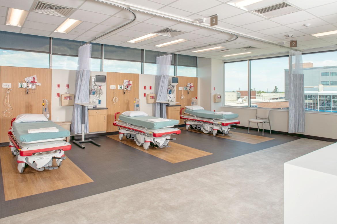 Department (SPD), thirteen Pre-Op/PACU bays, an oxygen storage and supply room on the ground level, and a new generator dedicated to the suite. The scope also included the installation of two new air handling units (AHUs), new boilers, a chiller, and surgical support equipment exclusively for this suite. Construction was carried out within the constraints of the existing building systems and tenants. Additionally, late-stage requirements from the Facility Guidelines Institute (FGI) had to be incorporated into the final design and construction plan, all while adhering to the designated opening date.